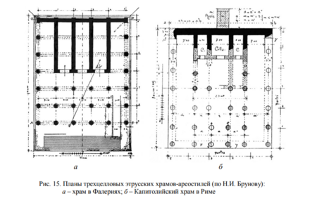 Этрусские храмы часто строились из дерева и кирпича, что отличает их от более поздних римских храмов, которые использовали камень и бетон. Однако некоторые храмы могли иметь каменные фундаменты. Они обычно имели прямоугольную форму и были расположены на высоких подиумах, что выделяло их на фоне окружающей местности. К сожалению, многие их архитектурные сооружения не дошли до наших дней