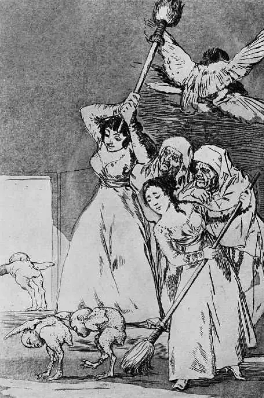 Одной из самых значительных работ после болезни стала серия гравюр под названием «Капричос». Франсиско Гойя сатирически изобразил общественное устройство, религиозные догмы и человеческие страсти. Он создал неприглядные образы, полные безысходности и отчаяния, показав, как люди теряют себя, оказавшись неспособными совладать с собственными желаниями и привязанностями.