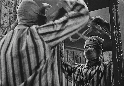 Для эффекта постепенного появления тела использовали технику многослойной оптической печати. Сначала снимали пустую постель, затем актёра Клода Рейнса на чёрном фоне в этапах грима: от скелета до полного облика. Полученные кадры совмещались с помощью оптического принтера, где прозрачность слоёв увеличивалась, создавая плавный переход от невидимости к видимости.