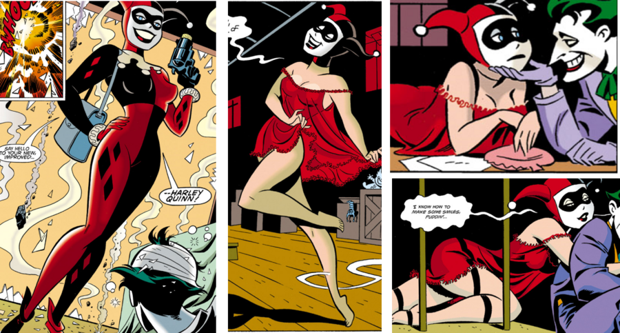 В 1993-1999 ХАРЛИ ПРЕДСТАЕТ ПЕРЕД ЗРИТЕЛЕМ В ОБРАЗЕ СЕКСУАЛЬНОЙ И ОПАСНОЙ ДЕВУШКИ, КОТОРАЯ МОЖЕТ ЗАЩИТИТЬ СЕБЯ ОТ КОГО УГОДНО, НО ПРИ ЭТОМ, ХАРЛИ — ЭТО ОБРАЗ МАКСИМАЛЬНО РАНИМОЙ ДЕВУШКИ, КОТОРАЯ СЛЕПО ЛЮБИТ ДЖОКЕРА И ДОБРОВОЛЬНО ДАЕТ ЕМУ ИЗДЕВАТЬСЯ НАД НЕЙ ВСЕМИ ВОЗМОЖНЫМИ СПОСОБАМИ.