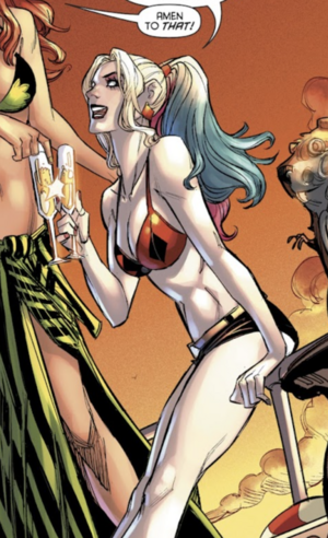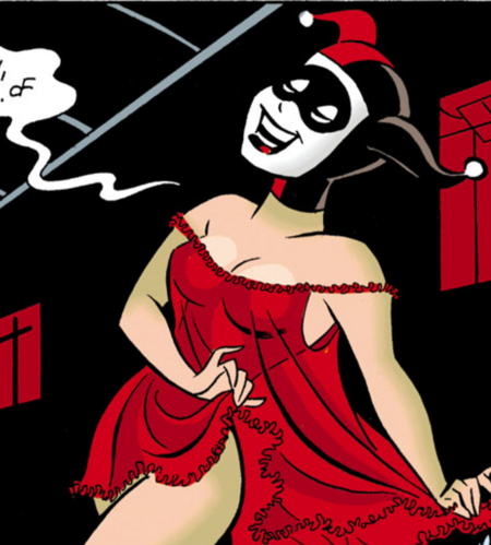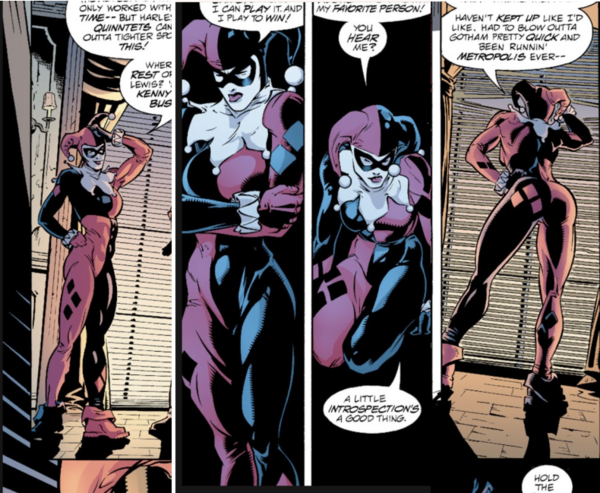 БЛАГОДАРЯ ДЕТАЛЬНО ПРОРИСОВАННОМУ КОСТЮМУ, ФИГУРЕ, ПОЗАМ; ОБРАЗ ХАРЛИ ПРИОБРЕТАЕТ ВСЕ БОЛЬШУЮ СОБЛИЗНИТЕЛЬНОСТЬ И СЕКСУАЛЬНОСТЬ.