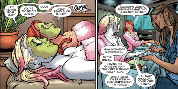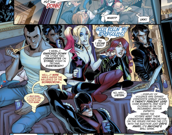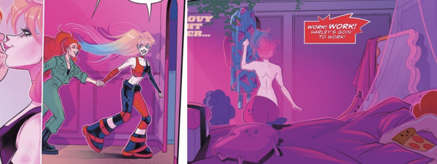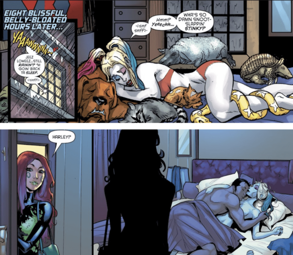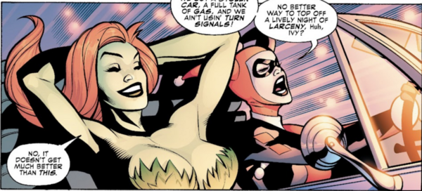 Вместе с визуальной составляющей и повесткой, безусловно меняются и отношения Харли. От моногамных отношений только с Джокером и тотальной зависимости от него, Харли пробует себя в новых отношениях с разными героями. Даже влюбляются в свою подругу, Ядовитого плюща и пытается развить с ней гармоничные отношения*(*30 ноября 2023 года Верховный суд признал экстремистским «международное общественное движение ЛГБТ». Деятельность этого «движения» в России запрещена).