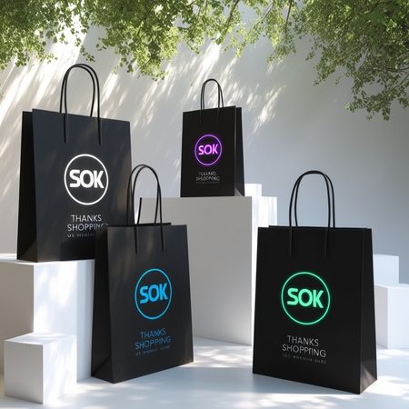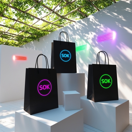 imagine prompt: create three 3D rendering black shopping bags. the bags are made of paper. There is a logotype in the left down corner on first, second and third bag. There is a 3D rendering white background with couple of white cubes. There is also a picture of neon laser on first, second and third bag. First bag has a neon blue color laser, second bag has neon purple color laser, third bag has neon green color laser on it. There is also a big sign under the laser picture on each bag. The sign is THANKS FOR SHOPPING. The logo is SOK in the circle shape. Use medium shoot. Dappled sunlight filtering through the canopy, creating a play of light and shadow.