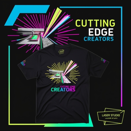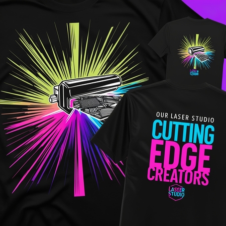 imagine prompt: create a vibrant and eye-catching merchandise line for our laser studio, featuring a range of products that celebrate the artistry and innovation of our laser workers. The primary color palette will be black, serving as a bold backdrop for striking neon accents.