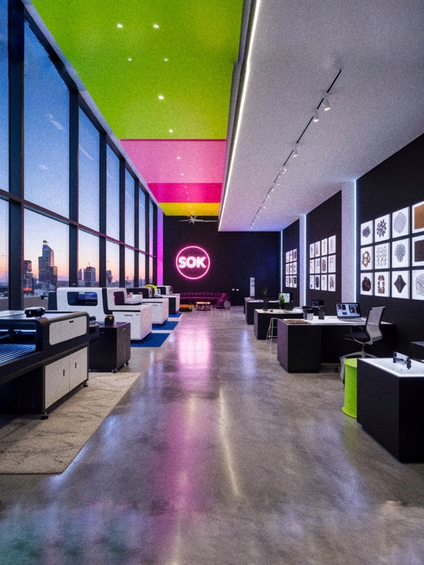 imagine prompt: Imagine stepping into a state-of-the-art laser studio that seamlessly blends cutting-edge technology with an artistic atmosphere. The space is expansive and filled with natural light, thanks to large floor-to-ceiling windows that offer stunning views of a vibrant urban landscape. As you enter, you’re greeted by sleek, minimalist design elements — polished concrete floors, clean lines, and a color palette of bright neon green, pink, yellow, purple, blue, blacks, and metallics that exude sophistication. The studio is divided into distinct areas for various laser applications, each equipped with the latest laser machinery and tools. In one corner, a high-powered laser cutter hums softly as it effortlessly slices through sheets of acrylic and wood, creating intricate designs. Nearby, a laser engraving station showcases a variety of materials — glass, leather, and metal —e ach adorned with detailed patterns and personalized engravings. The walls are adorned with a rotating gallery of finished projects, showcasing the versatility of laser technology in art, design, and manufacturing. You can see everything from custom jewelry to architectural models. One wall has a big