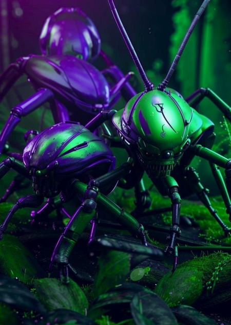 Инопланетные жуки, зеленая и фиолетовая палитра, постер стиль 3D рендер