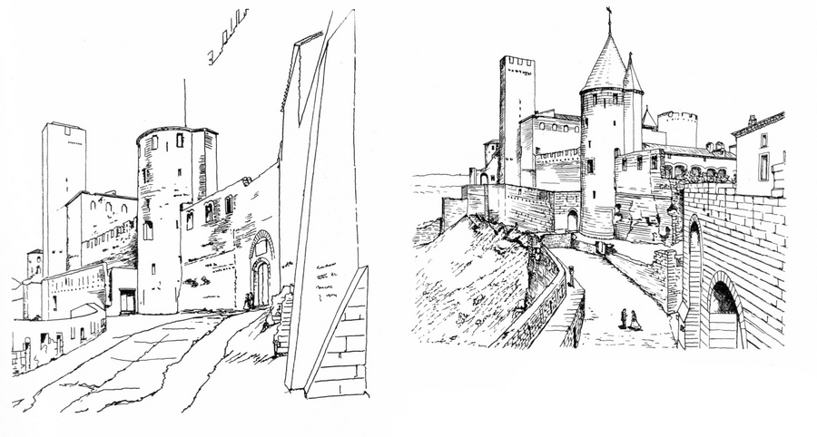 1. Рисунки Виолле-ле-Дюка, реконструкция крепости Каркассон, 1830–1890 гг., Франция. 2. Каркассонский замок внутри, ворота, 1130–1150 гг., Франция.