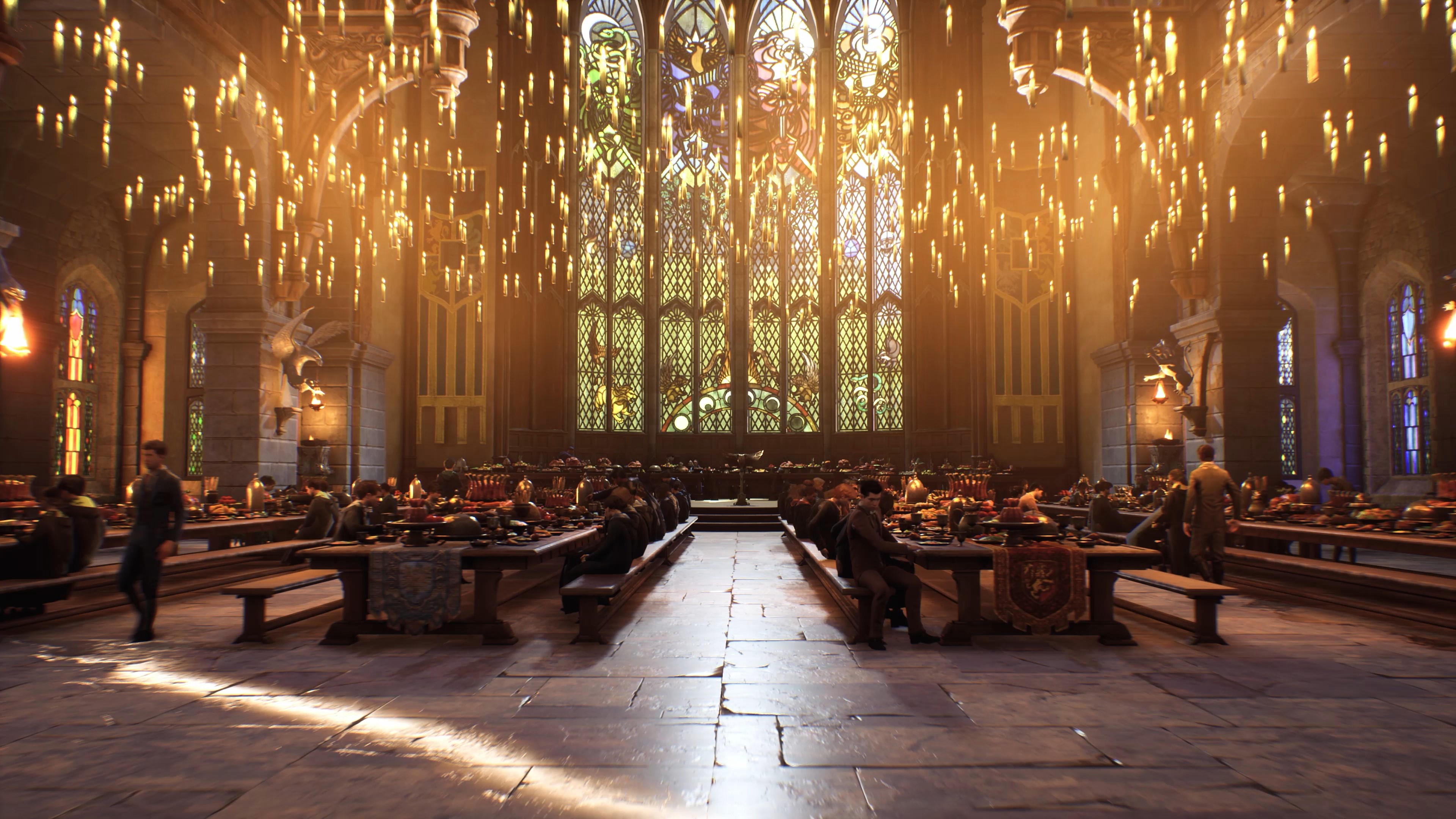 Особенно интересной мне показалась реализация главного зала — важной части замка, где и игровые персонажи, и настоящие актёры собирались тарпезничать или слушать речи директора. Его цифровая версия не уступает каноничной, однако, так или иначе, дополнена некоторыми техническими решениями. Пространство зала оформлено в традициях английской готики: декоративные арки, характерные витражи и каменные стены.