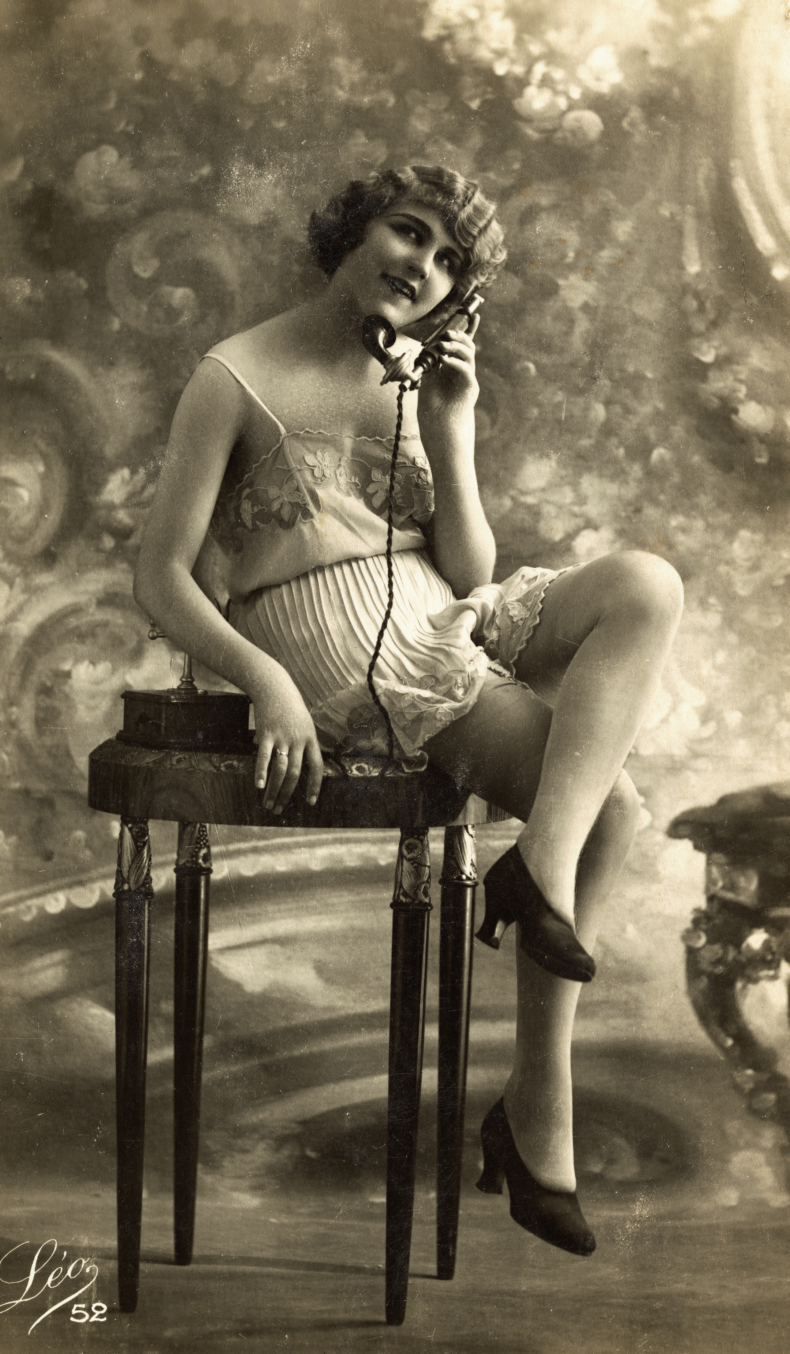 Еще одним способом изображения женщины в нижнем белье в фотографии стал сюжет разговора по телефону. Включение телефона в композицию служило не только техническим элементом, но и важным контекстуальным акцентом, связывающим образ женщины с современной реальностью. Это отличало такие фотографии от традиционных мифологических или аллегорических изображений, представляя женщину в более реалистичном и доступном для зрителя контексте. Интриговал, намекая на тайные отношения, не прибегая к явной демонстрации эротизма.