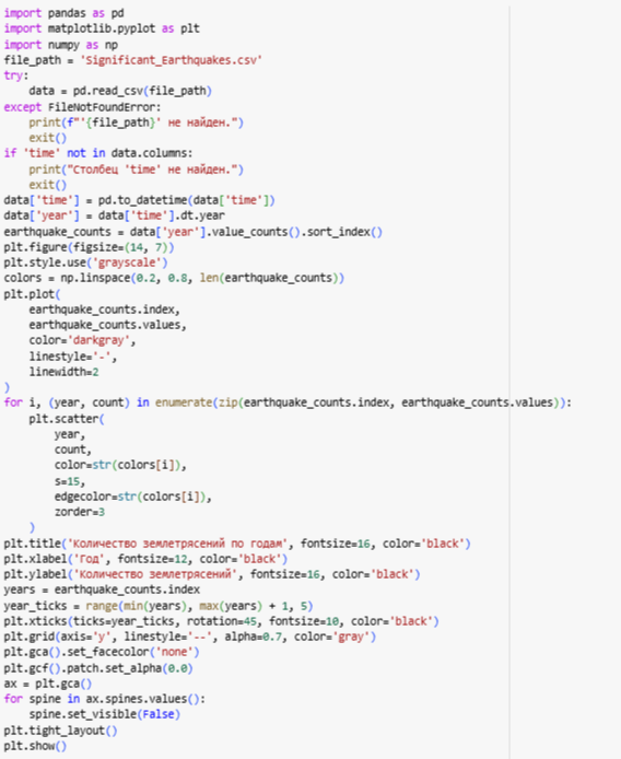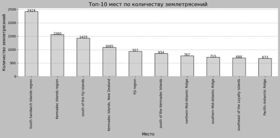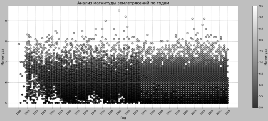 Из диаграммы виден явный рост количества зарегистрированных землетрясений, причем своего пика он достигает в 2023 году, затем начав неохотно идти на спад. Несмотря на то, что график показывает значительное снижение сейсмической активности к 2025 году, стоит помнить о том, что этот год только начался. На данный момент диаграмма говорит о том, что показатель продолжает оставаться довольно высоким.