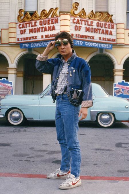 Впервые Марти предстает в очень гармоничном образе 80х годов: джинсы и необычного фасона джинсовка, клетчатая рубашка, бордовая футболка под ней, сочетающаяся с таким же бордовым логотипом на белых кроссовках.
