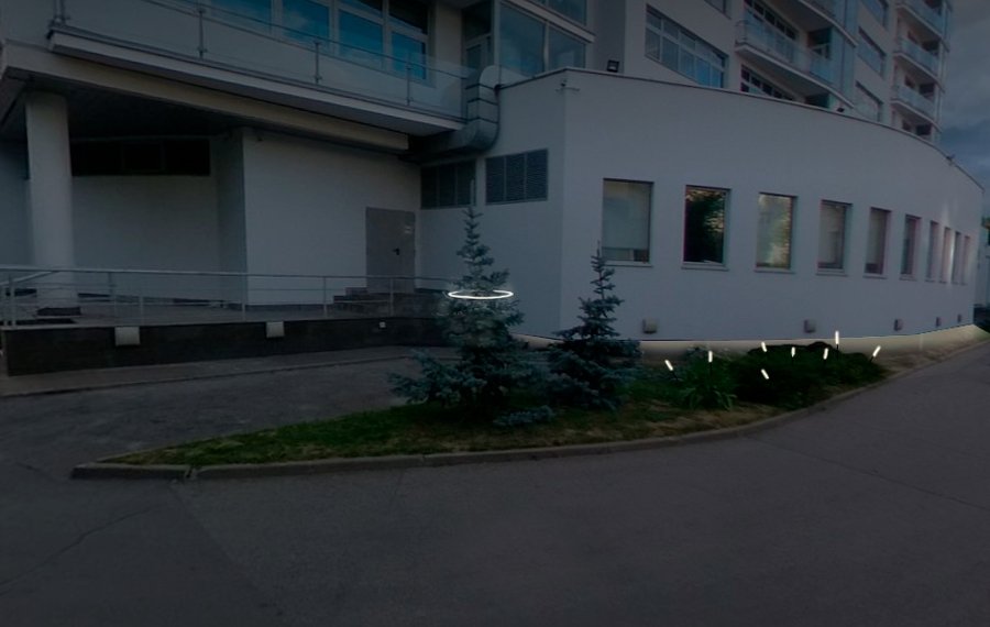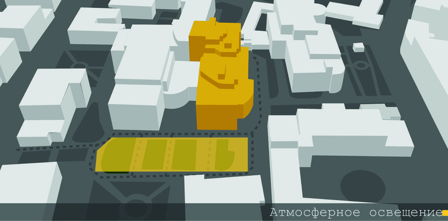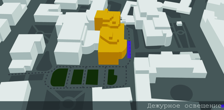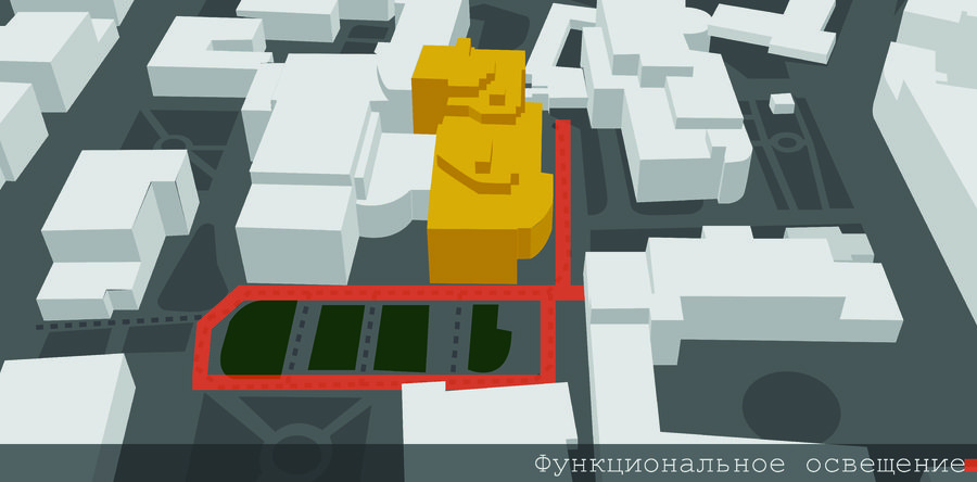 Здание наполовину относится к компании ТМК, нет возможности устанавливать освещение по всей длине фасада. (Может повлиять на общее восприятие здания и сквера, отсутствие единой стилистики на всем здании).
