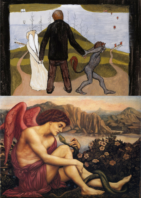 На этой картине представлен момент искушения. Образ ангела отвечает за добрую и чистую часть человеческой души, а черт за зло и грех.