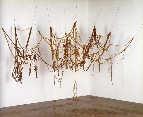 Хлопковые нити Евы Гессе задают ее работам внутреннюю динамику. Сами по себе волокна крепко перетянуты, при этом они виснут свободно в общей композиции.