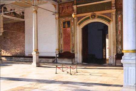 Внутренние дворы и некоторые важные помещения облицованы мрамором, что подчеркивает статус дворца как резиденции султана и добавляет впечатляющую роскошь интерьеров.