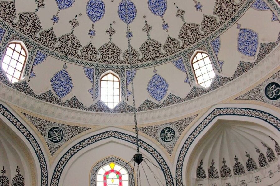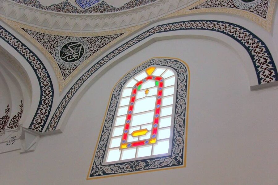 Светлое пространство, витражи на окнах и росписи на стенах, теплый желтый свет, подчеркивают и дополняют атмосферу простора и уюта. На окнах находятся решетки, типичные для османских мечетей.