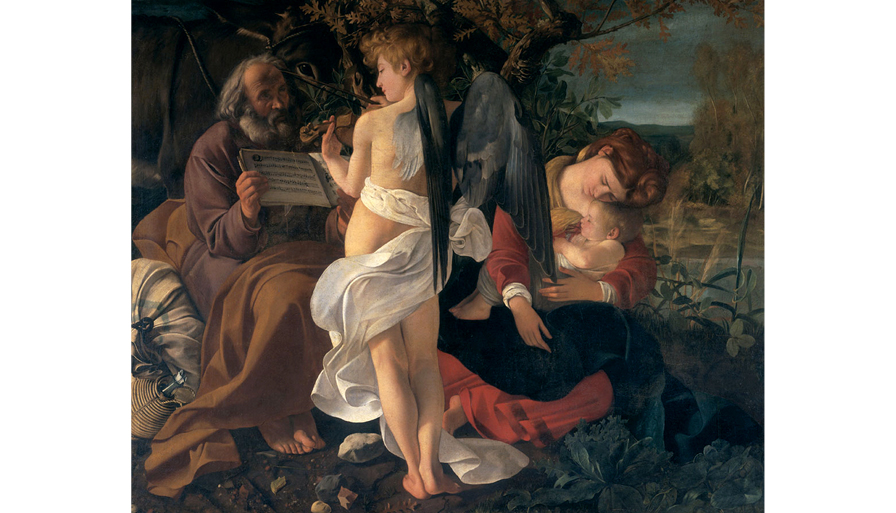 Караваджо приобрёл настоящую известность благодаря своим картинам на библейские темы, среди которых выделяется новаторская работа «Отдых на пути в Египет» (1597). Главная ценность этой картины заключается в искусно воссозданной световоздушной атмосфере, которая наполняет её поэтичностью и спокойствием, дополненной скромным пейзажем, написанным под впечатлением от родной Ломбардии с её тростниками, осокой у водной поверхности, серебристыми тополями на фоне холмов и вечернего сизого неба. Тело ангела в центре композиции изображено с необыкновенной чувственностью. В тот же период Караваджо создал такие работы, как «Экстаз св. Франциска» (1595) и «Жертвоприношение Исаака» (1598)
