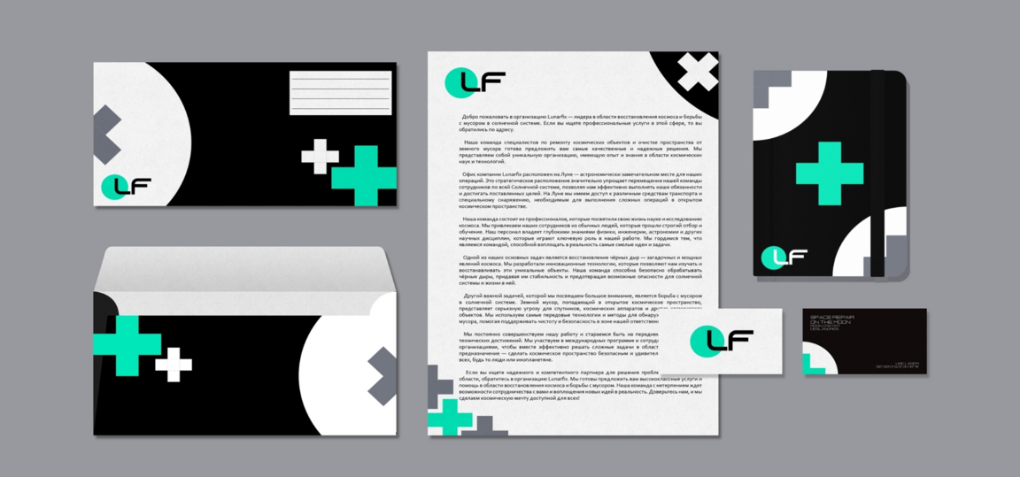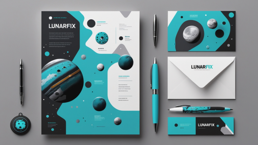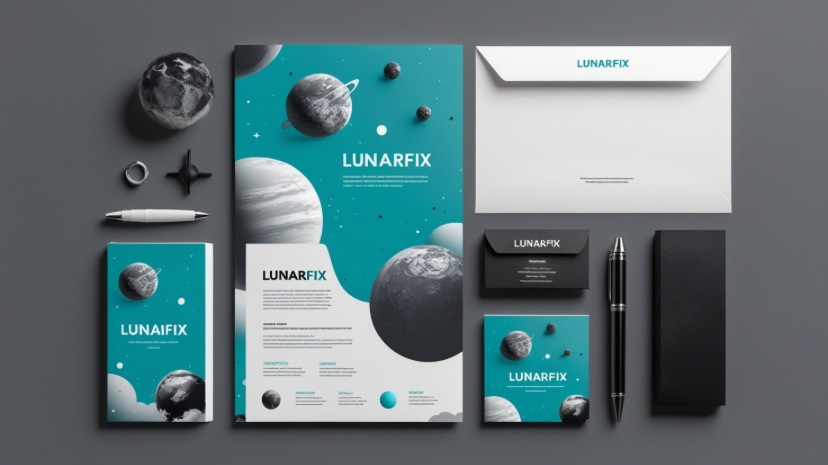 Промт: create paper media using the company name «lunarfix» and brand colors. The primary colors for the brand are turquoise, white, gray, and black. The palette should evoke a sense of innovation, reliability, and professionalism, suitable for a company involved in space repairs. be sure to depict on the mockup a sheet for printing with the design (you can use flat figures of planets or repair tools), a pen, an envelope, a notepad and other media.
