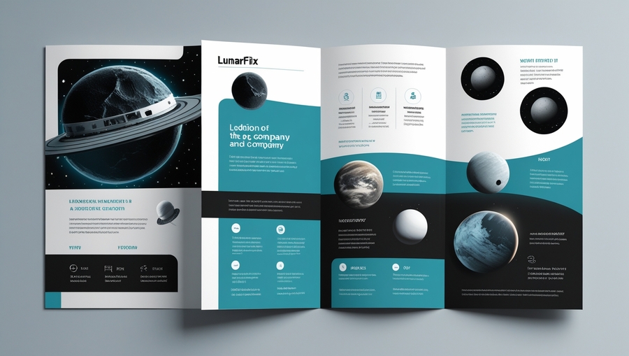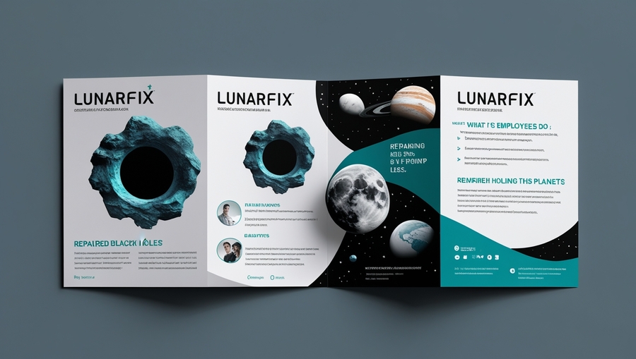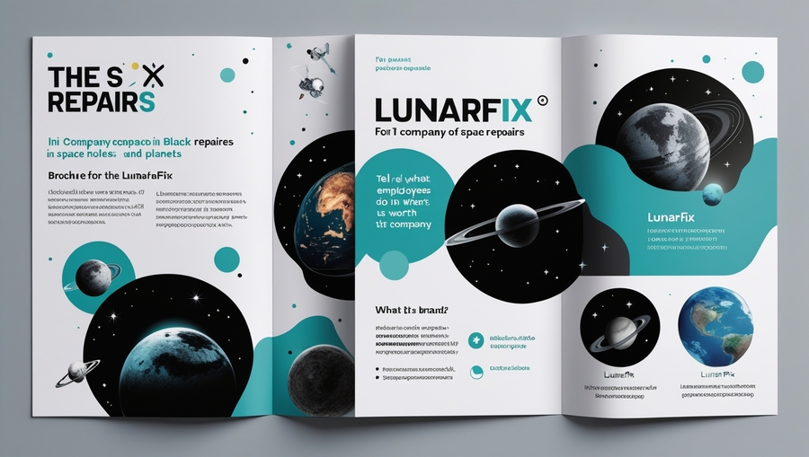Промт: create a brochure for the company «lunarfix», which is engaged in space repairs. in it, in addition to images of repaired black holes and planets, tell us about what the company’s employees do and in what cases it is worth contacting this company. The primary colors for the brand are turquoise, white, gray, and black. The palette should evoke a sense of innovation, reliability, and professionalism, suitable for a company involved in space repairs.
