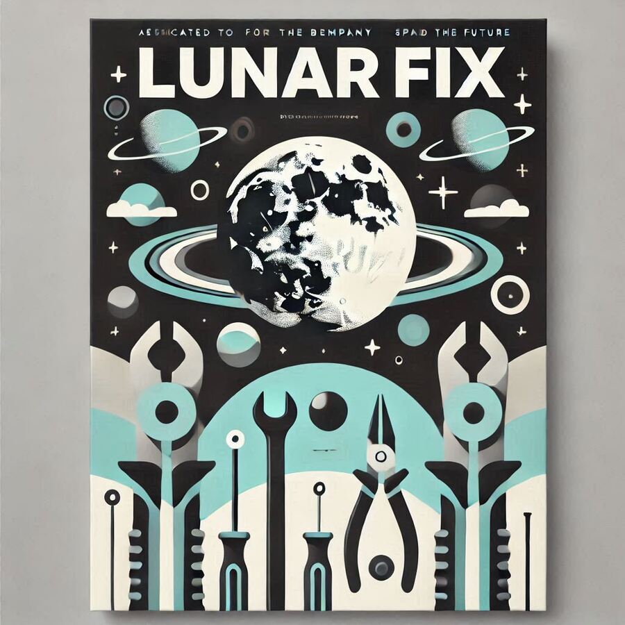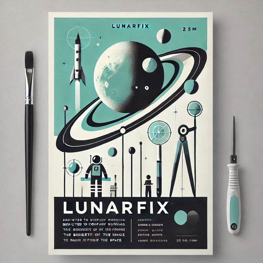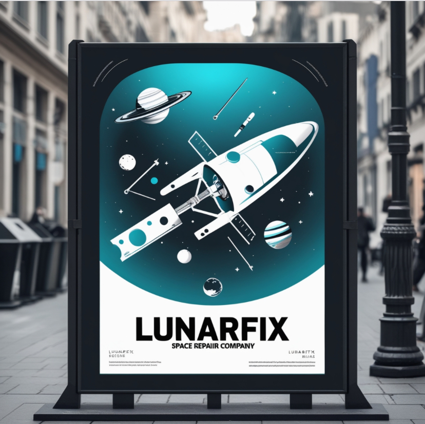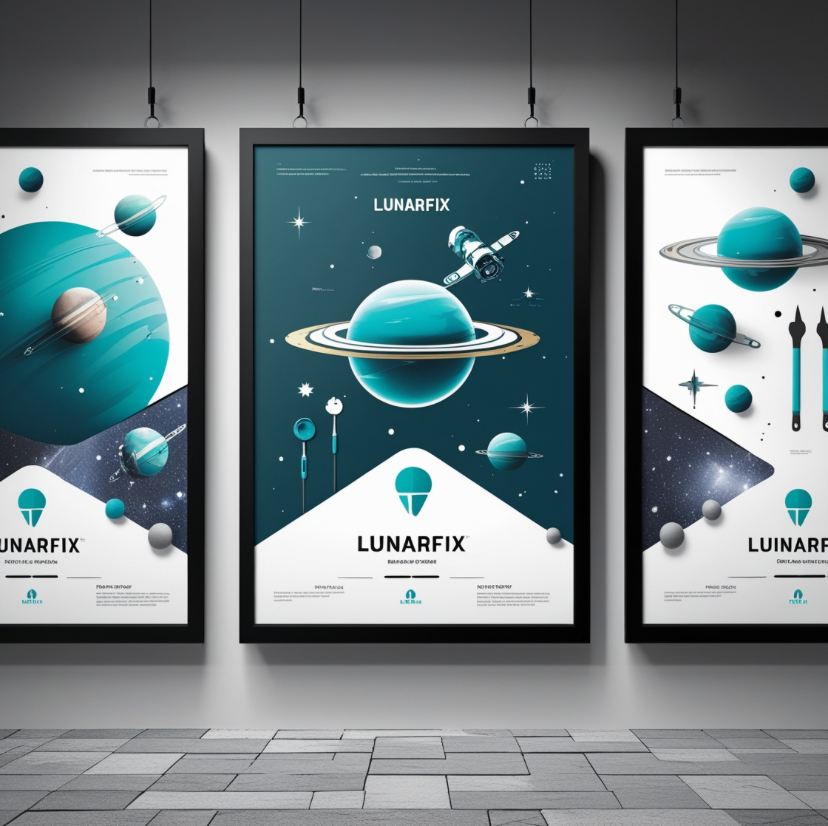Промт: create mockups of outdoor posters dedicated to the space repair company «lunarfix». You can use tools, planets and other space elements to make the poster visually beautiful. At the bottom there should be a logo and the company name itself. at the same time, the poster should be minimalistic and carry a meaning, and not just be a pretty picture. The primary colors for the brand are turquoise, white, gray, and black. The palette should evoke a sense of innovation, reliability, and professionalism, suitable for a company involved in space repairs.