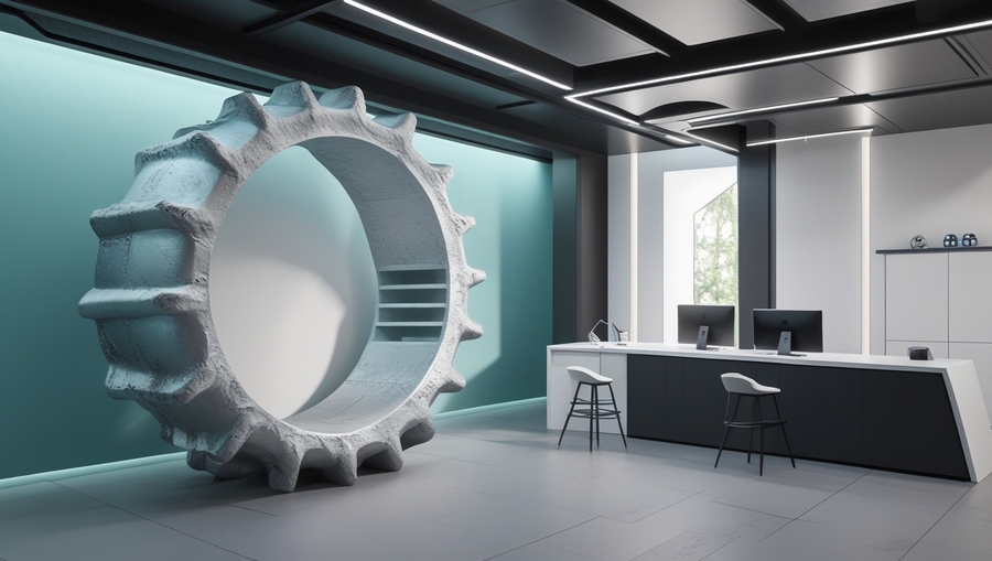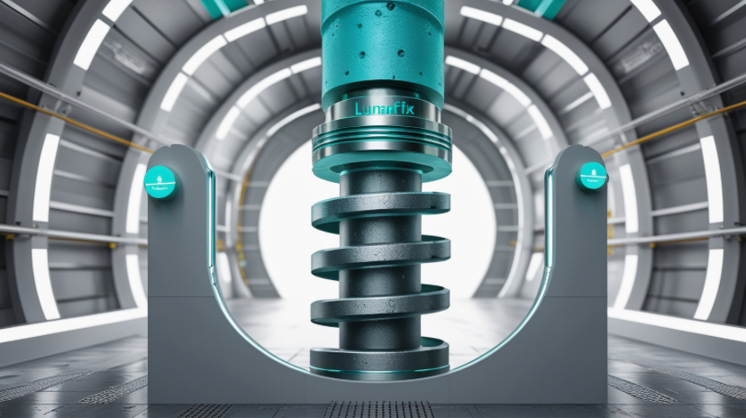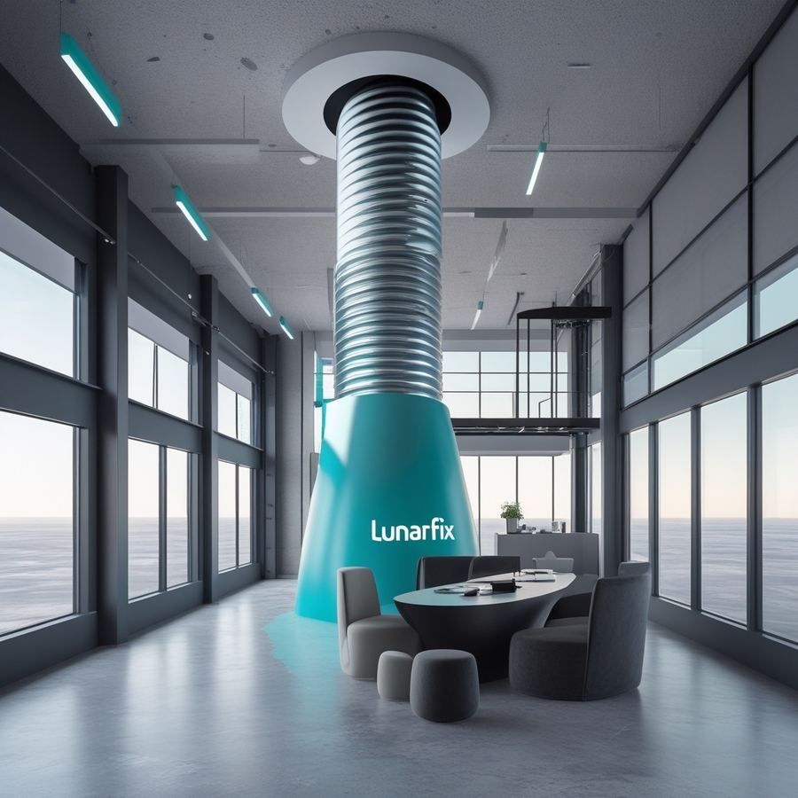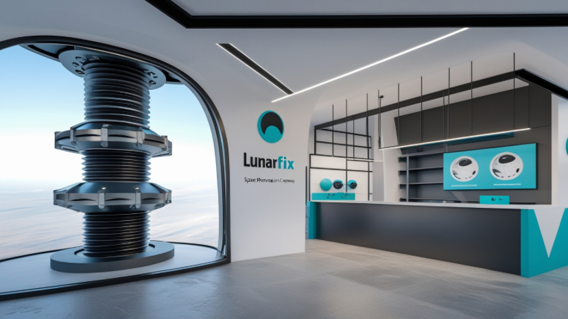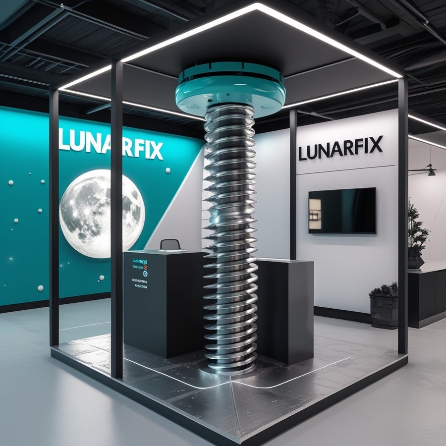 Промт: create a space for space renovation company lunarfix. this building is made in the shape of a huge screw that is screwed into the real Moon. the building itself is made of metal, everything inside is equipped in a modern style, where the entire interior is quite simple, but at the same time very stylish. The primary colors for the brand are turquoise, white, gray, and black. The palette should evoke a sense of innovation, reliability, and professionalism, suitable for a company involved in space repairs.