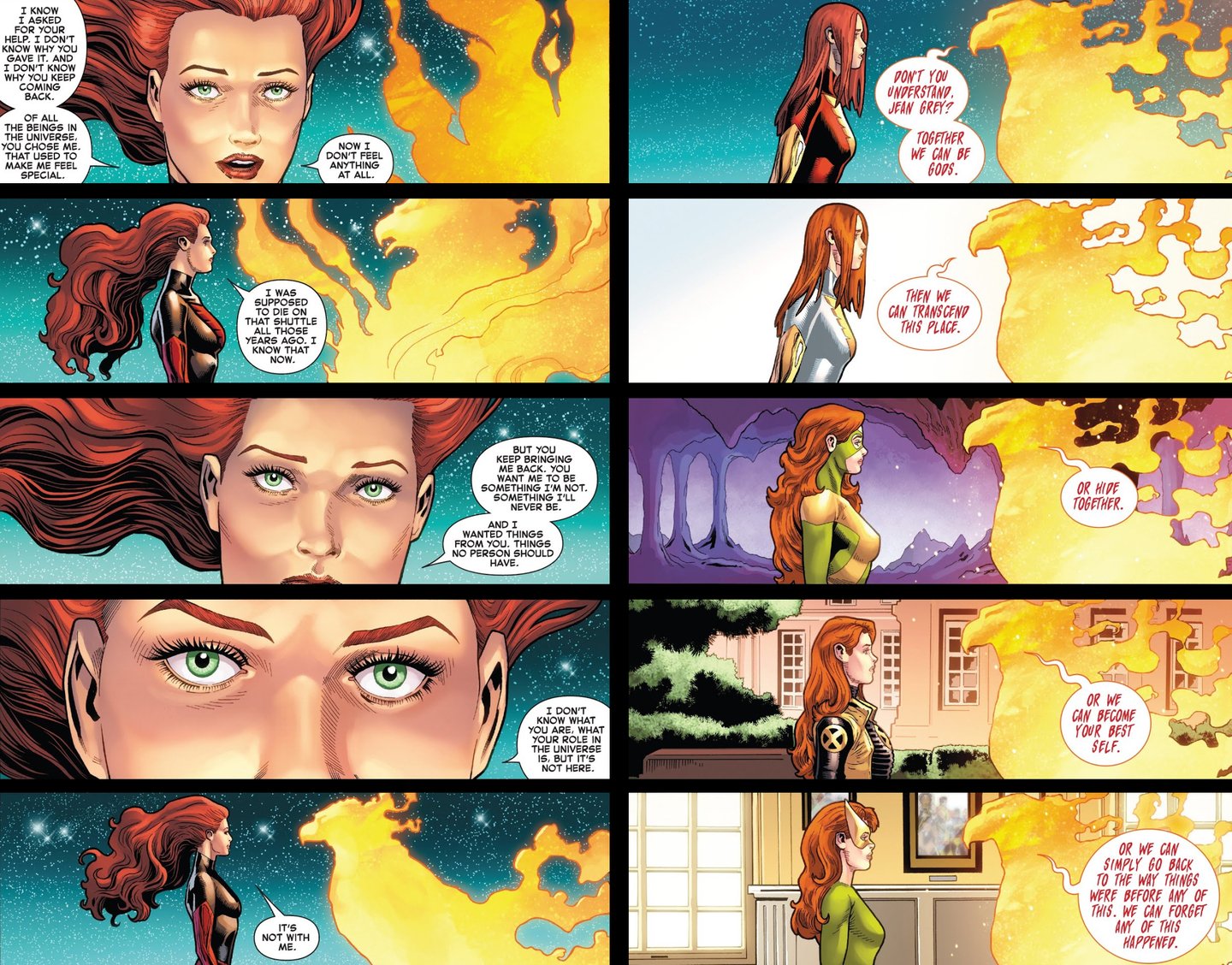 Но Люди X узнают, что Феникс удерживает воскресшую Джин в отдельном мире, специально созданном для нее и в котором она не помнит свою прошлую жизнь. Все это было сделано для того, чтобы подготовить Джин к встрече с Фениксом так, как это нужно именно ему. Когда же она все вспомнила, то заявила Фениксу, что больше не желает быть его носителем. Несмотря на уговоры, Джин была непреклонна. Феникс смирился с этим решением и ушел.