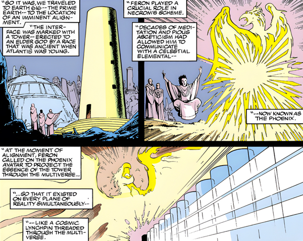Феникс, обладая разумом, изучал космические просторы, подобно другим космическим сущностям. Изначально Сила Феникса была лишь аморфной энергией, но в давние времена она прибыла на Землю и встретила Ферона, мага, почитавшего мифическое создание. Вдохновившись его видениями, он принял облик жар-птицы, которое мы наблюдаем и теперь. Ферон обратился к Фениксу с просьбой. Ему нужна была энергия Феникса, чтобы создать каменный столб, который бы служил световым маяком в Мультивселенной. На Земле-616 именно столб стал базой для британской суперкоманды «Экскалибур». Впоследствии к ней присоединилась Рэйчел Саммерс, будущий лидер всей команды того времени.