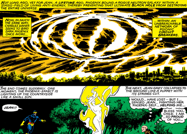 Используя свои могущественные силы, Феникс обеспечил выживание Людей Икс, осуществив аварийную посадку шаттла в заливе Ямайка около Нью-Йорка. Он нес ответственность за состояние Джин, схожее с комой, и помещение ее в коконоподобную конструкцию на дне залива, где она оставалась на протяжении многих лет до полного восстановления от полученных травм. Так, Феникс исполнил свое обещание, данное Джин. Космическая сущность Феникса создала клон тела Джин и абсорбировала часть ее сознания, заменив ее, пока настоящее тело находилось в анабиозе.