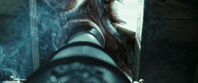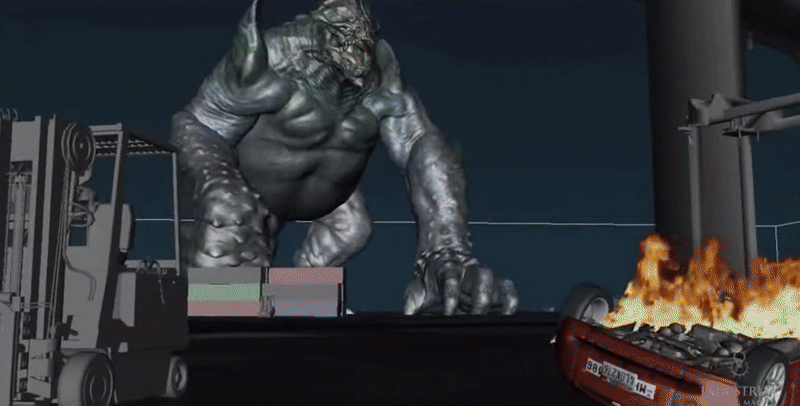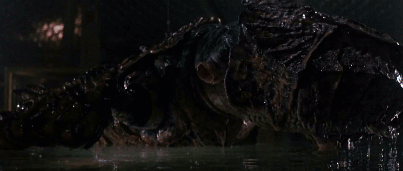 Текстура монстра получилась очень убедительной, тогда как его движения выглядят достаточно скованными. Мы почти не видим монстра в движении, он в основном стоит, поворачивается и ударяет лапой сверху в низ. Динамизм в эпизодах с монстром строится не за счет передвижения монстра, а за счет операторской работы.