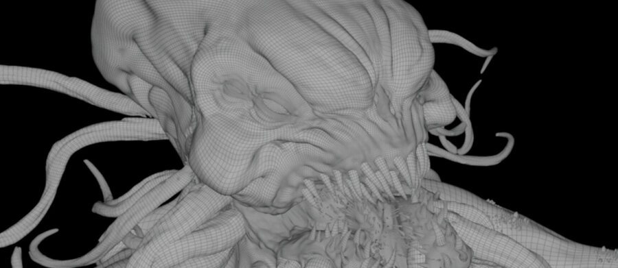 Референсами для текстур были намокшие шкуры носорога и слона, шелушащиеся мозоли, текстуры бычьих внутренностей. Поверхность щупалец изломана глубокими трещинами, обнажающими розовую нежную плоть внутри.