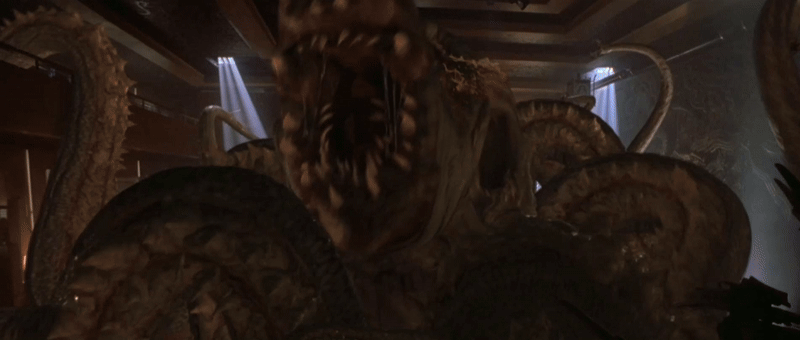 Несмотря на то, что аниматронные части тела все еще делают движения конечностей резкими, не гибкими и плавными, например, в шоте, где чудовище душит героиню, суставы «пальцев» не сгибаются вокруг плеч актера, здесь существо уже выглядит существенно лучше, чем в предыдущем фильме, именно за счет подвижности огромного рига.