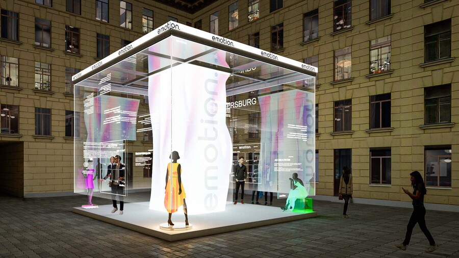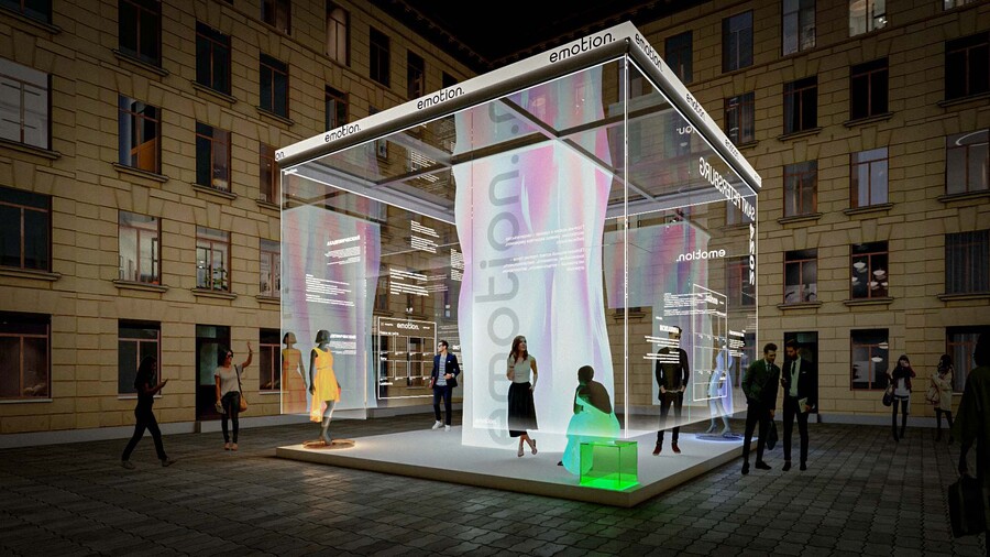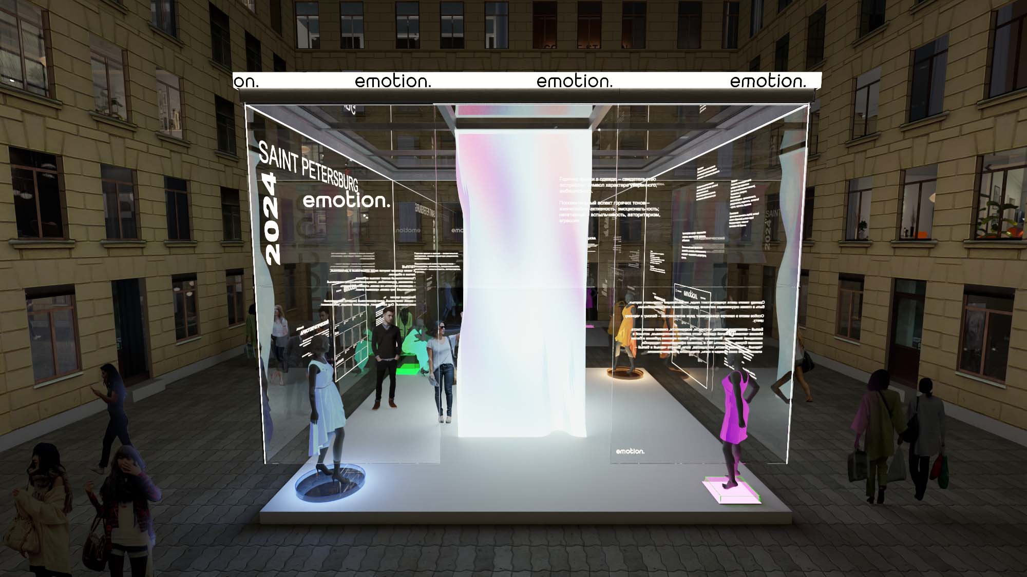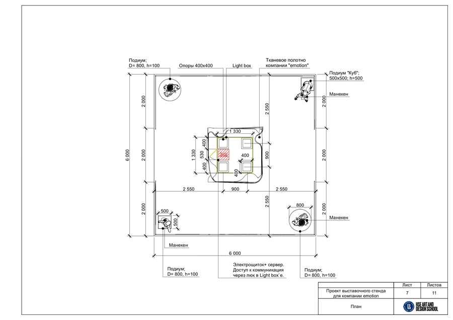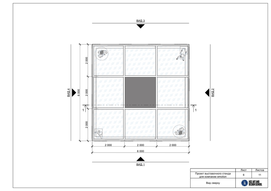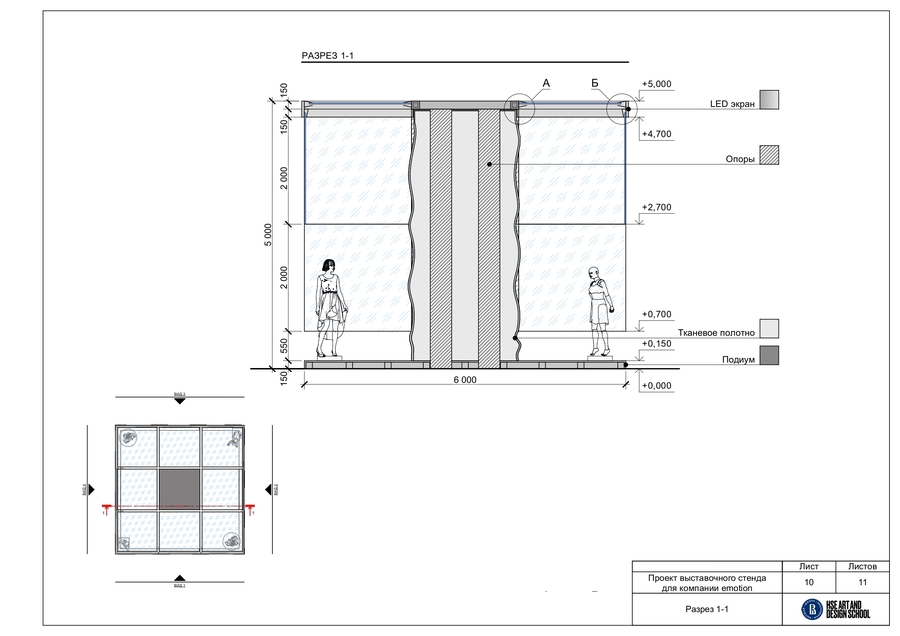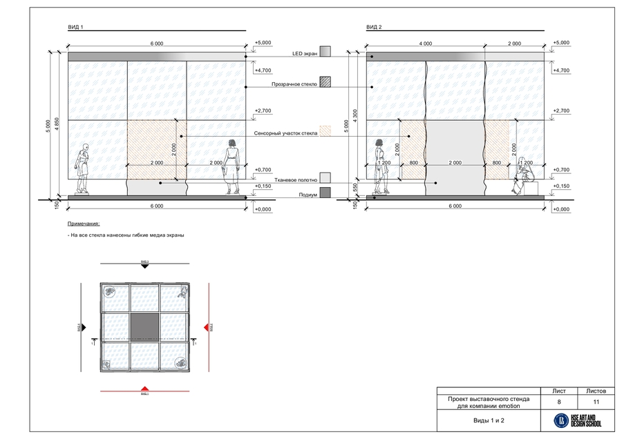 Техническая документация для выставочного стенда компании emotion. В составе: 1. Вид сверху и план 2. Виды сбоку и разрез 3. Детали А и Б