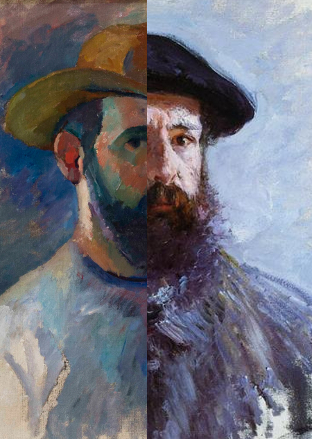 Ещё одна довольно смешная пара — два практически одинаковых автопортрета. Если рассмотреть их ближе по принципу «найдите пять отличий», они действительно найдутся. Фактура кожи, форма бороды и степень её проработанности (у Моне мы практически видим отдельные волоски), свето-теневая проработка. И, самое забавное, это одежда. Если присмотреться, можно увидеть, что на правом портрете тоже есть галстук.