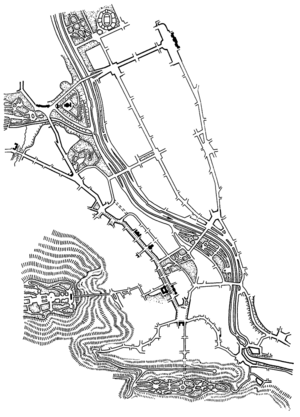 1 — Львиная бухта; 2 — главная площадь центрального рынка; 3 — его северная часть; 4 — булевтерий (административное здание); 5 — пропилеи (парадный вход); 6 — римский нимфей (святилище); 7 — гимнасий (образовательное учреждение); 8 — Дельфиний (священный участок Аполлона Дельфиния)
