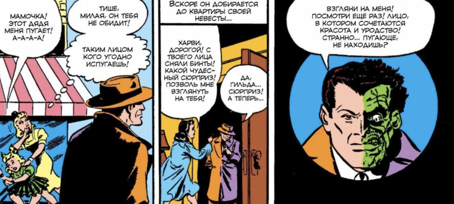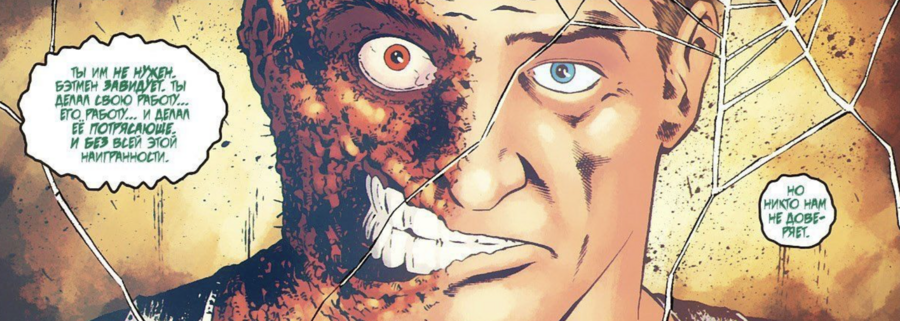 Харви Дент (также известен как Двуликий) — это персонаж вселенной DC Comics, а также один из самых известных и опасных злодеев. Его уникальность заключается в том, что базово он не обладает какими-либо суперспособностями, но особенность его личности заключается в дуализме, что можно заметить по прозвищу. Этот персонаж для автора стал интересен с точки зрения психологии, потому что у него действительно очень сложный психологический профиль, у данного злодея было очень сложное детство, которое впоследствии повлияло на всю его дальнейшую жизнь.