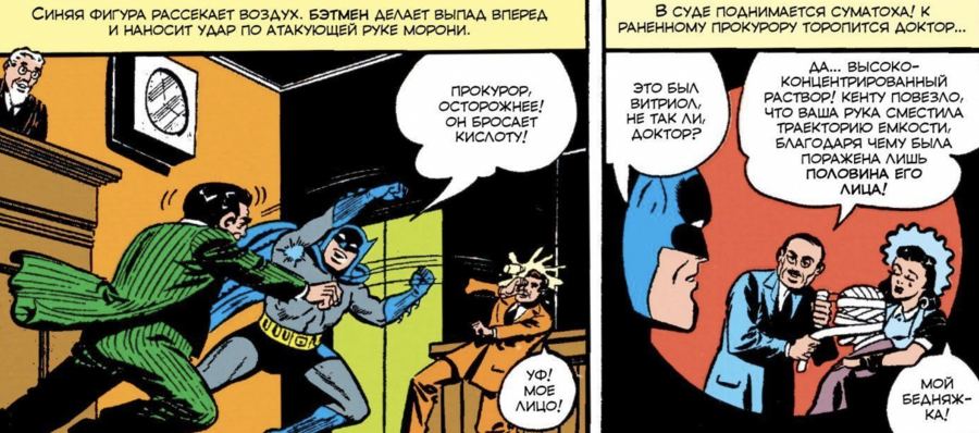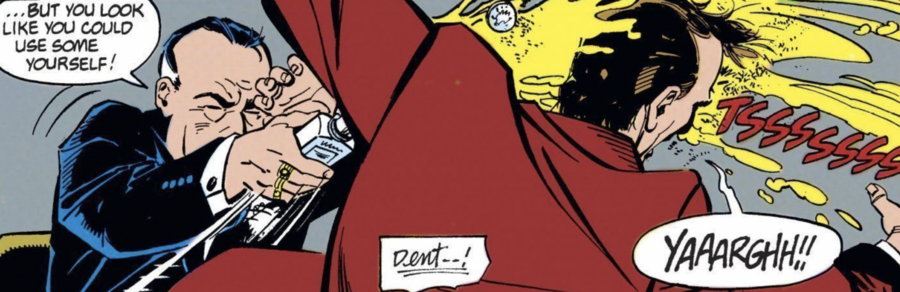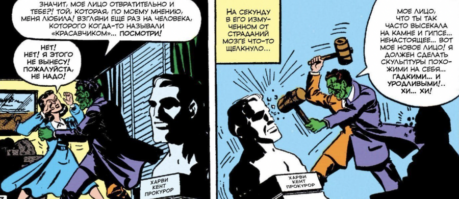 Комикс уже сразу начинается с активных событий. Герой прибывает в зал сюда вместе со своей невестой, где он должен вести дело Марони, одного из самых крупных преступников Готэма. На месте убийства была найдена монета-талисман Марони с его отпечатками, так что Вина Марони была очевидна. Он решает отомстить Харви (пока еще) Кенту и выплескивает ему в лицо содержимое банки с кислотой. Бэтмену удалось лишь немного сбить траекторию движения жидкости, поэтому кислота поразила только одну половину его лица.