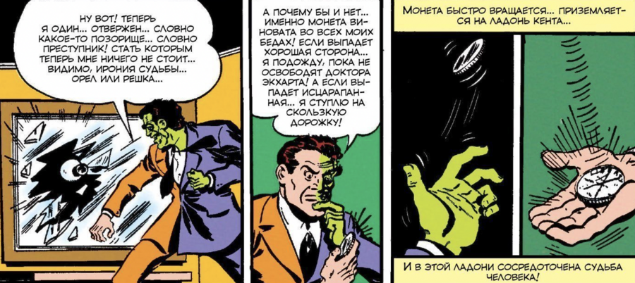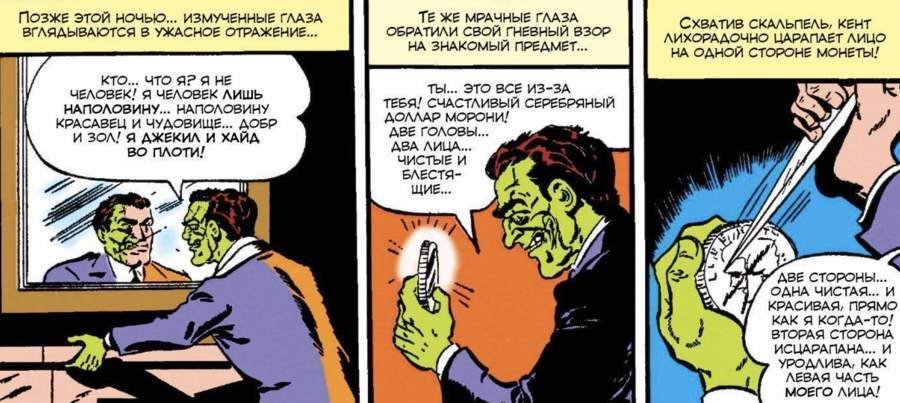 Из этого отрывка очевидно, что не смотря на все злодеяния совершенные в прошлом, в нем все еще боролась та часть личности, которая отвечала за добро и честность, и также мечтала восстановить справедливость по-настоящему, а не с помощью монеты.