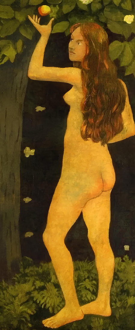 Ева у Серюзье — европейка, а не необузданный первобытный образ. Ее фигура, пропорции и перспектива на картине скорее продолжают традиции Ренессанса с его стремлением к познанию человеческой природы. Сравнение задних планов двух картин отлично иллюстрирует то, как. наглядный символизм живописи Гогена трансформировался в репетативную математичную орнаментальность символа. Зритель перед картиной Серюзье хочет понять какой силе подчиняются опадающие с Древа Познания листья так же, как Ева хочет познать суть мироздания.