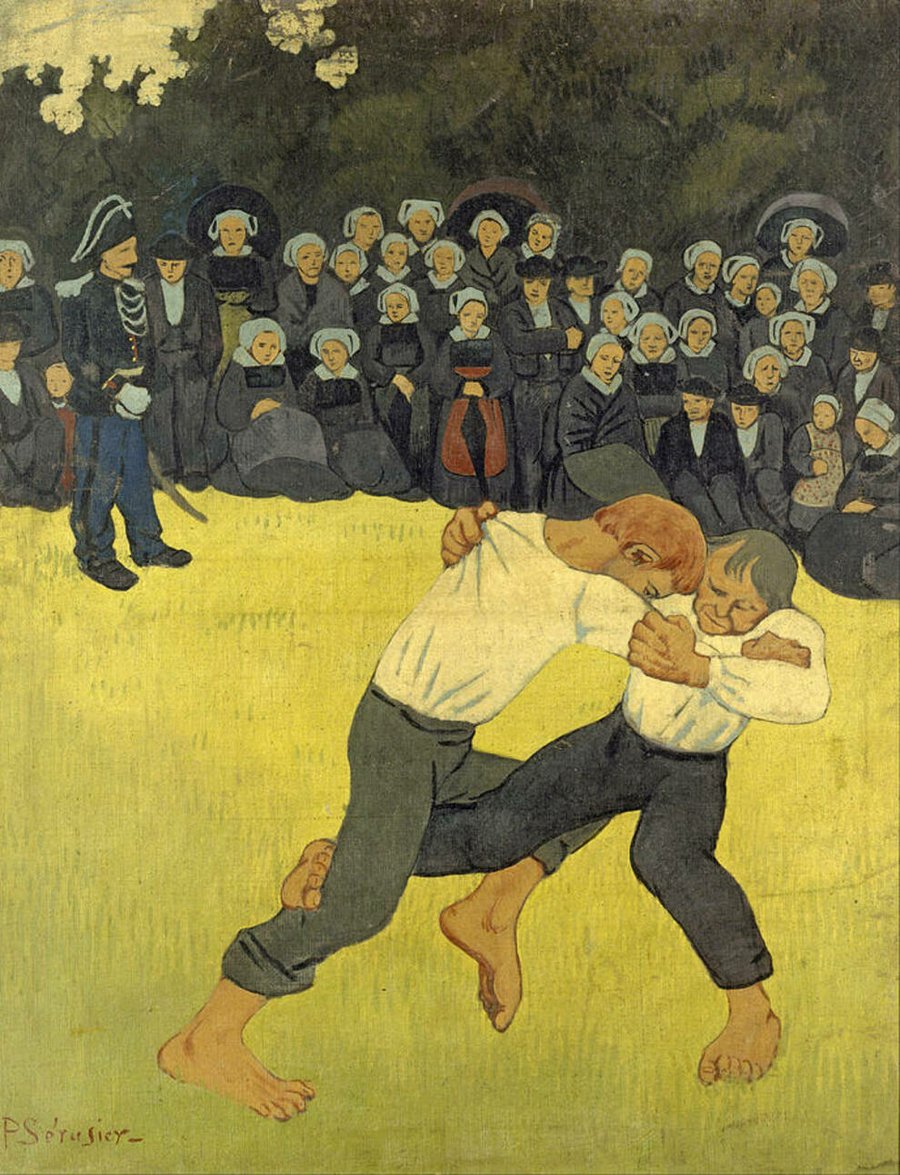 Сюжет «Борьбы Иакова с Ангелом» перемещается на передний план и трансформируется в куда более ясную, но не менее воспеваемую художником борьбу двух бретонцев. Национальное для Серюзье крайне важно: он фокусируется на культурной идентичности. При этом сам характер борьбы статичнее, а исход этой (в отличии от полотна Гогена) непредсказуем. Борьба так же может быть интерпретирована как отражение их сопротивления внешним влияниям, которое Серюзье считает священным.