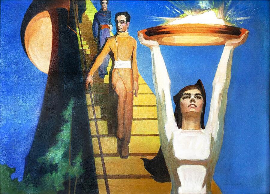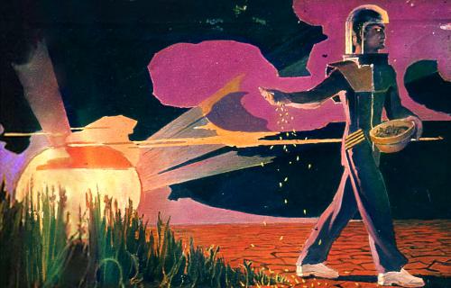 Чем занимается человек будущего? На картине «Сеятель» изображена раскалённая, трещиноватая земля, уходящая за горизонт. Космонавт разбрасывает семена, и уже появляются первые ростки. Вера в то, что необжитая и умирающая планета станет прекрасной, присутствует в этом образе.