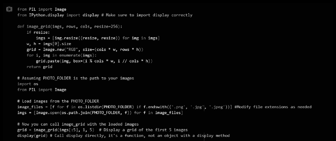 Сначала я проверила ресурсы GPU, далее загрузила первые необходимые библиотеки. Потом я импортировала датасет с картинками и вывела первые 5 в виде сетки.