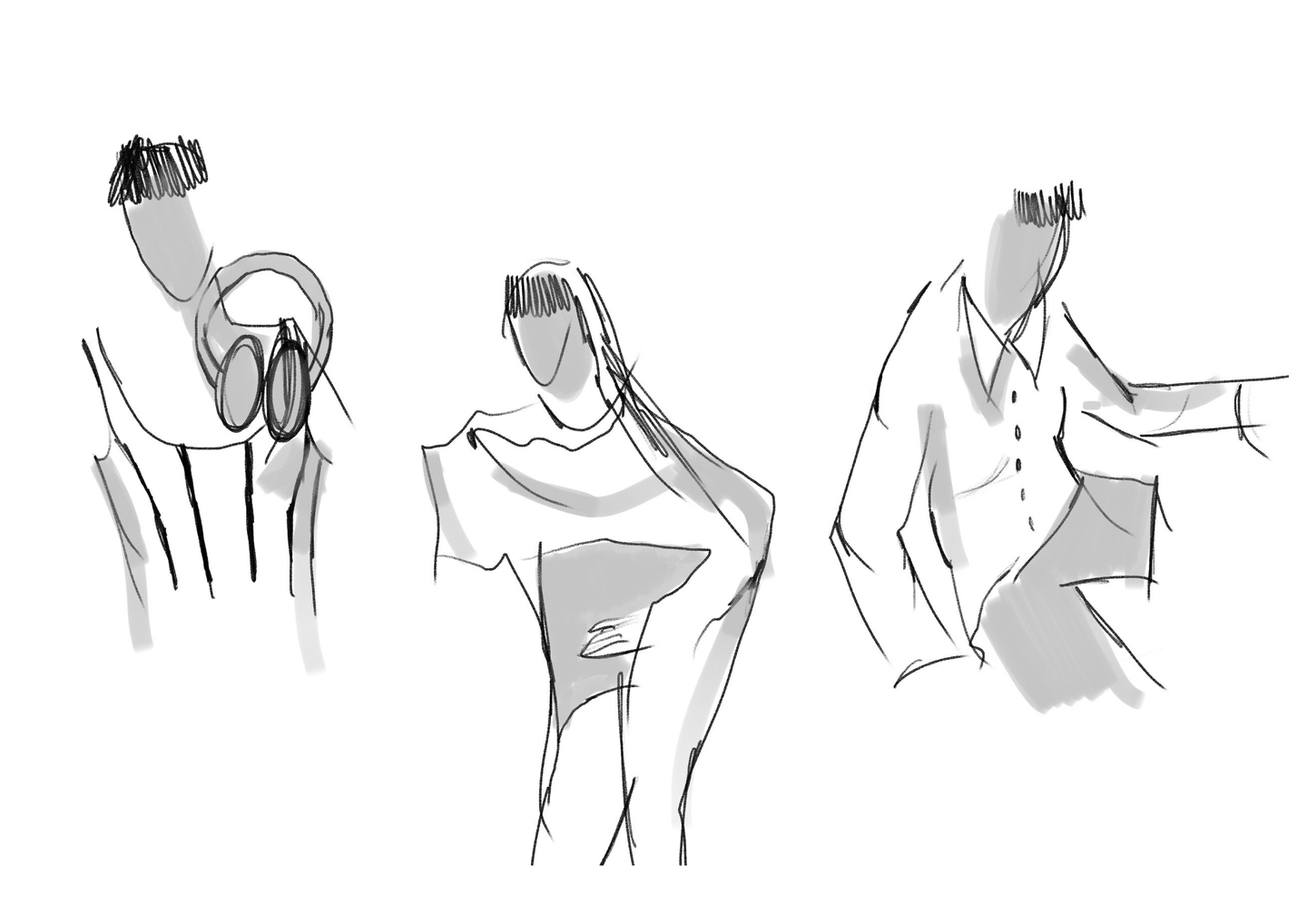 В основном, ее образ создается за счет плавных графичных линий. Вырез и горловина могут быть любых форм (на одно плечо, круглая, квадратная, v-образная), тем не менее края одежды с чистыми обработками, без декора. В костюме нет ярко-выраженных острых линий, но создается впечатление цельного силуэта. Очертания одежды выглядят достаточно органично и натурально, так как плавные линии сочетаются с простой геометрией и прямыми четкими линиями.