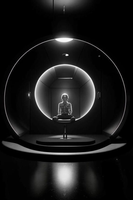 Комната с капсулой для медитаций Промт: черная темная комната с круглой капсулой посередине, где находится силуэт человека в позе йога