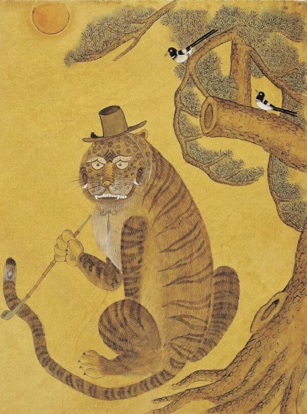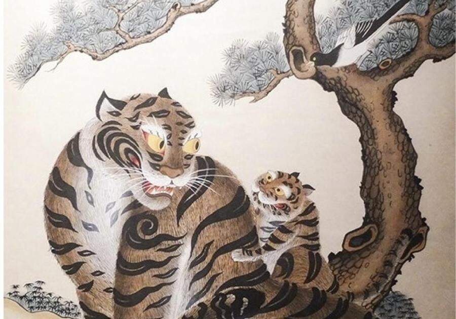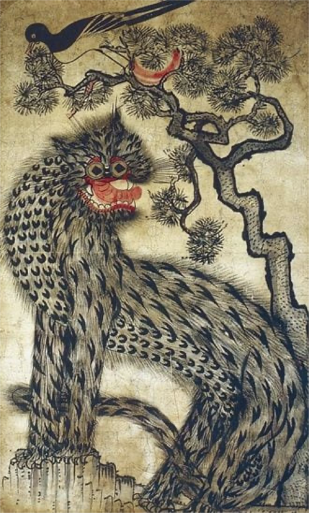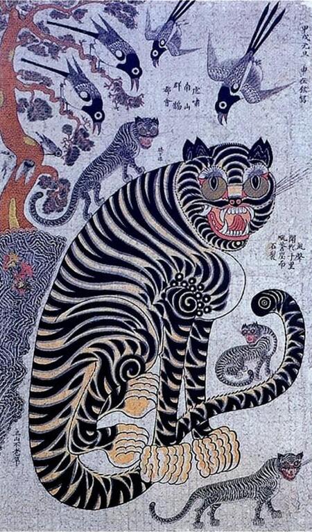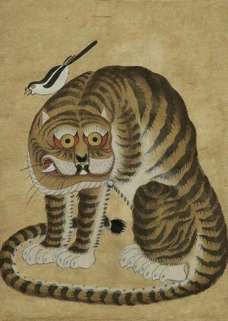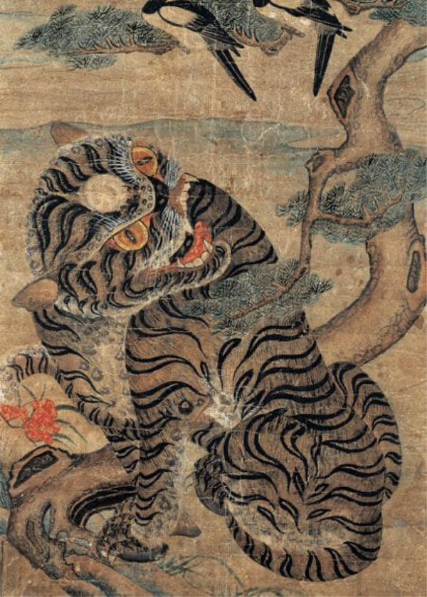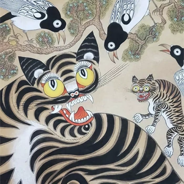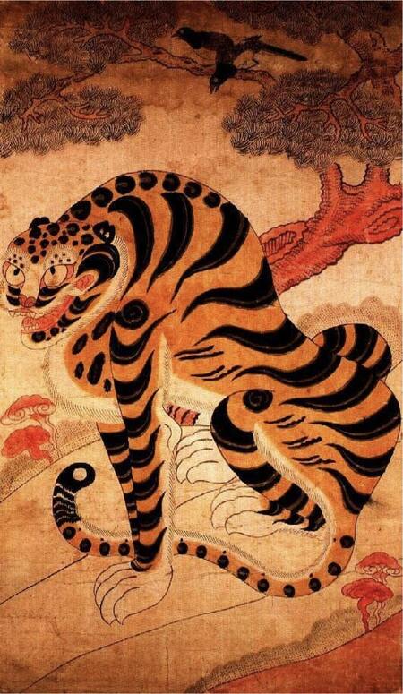 В корейской живописи тигр олицетворяет множество значений, которые варьируются в зависимости от контекста и композиции. В одних картинах тигр изображается как могучий защитник, который охраняет дом и семью от злых духов и несчастий. В этом контексте он становится символом надежды и благополучия, что особенно важно для простых людей, стремящихся к безопасности и стабильности в своей жизни.