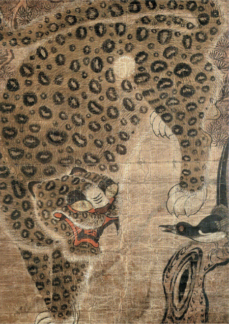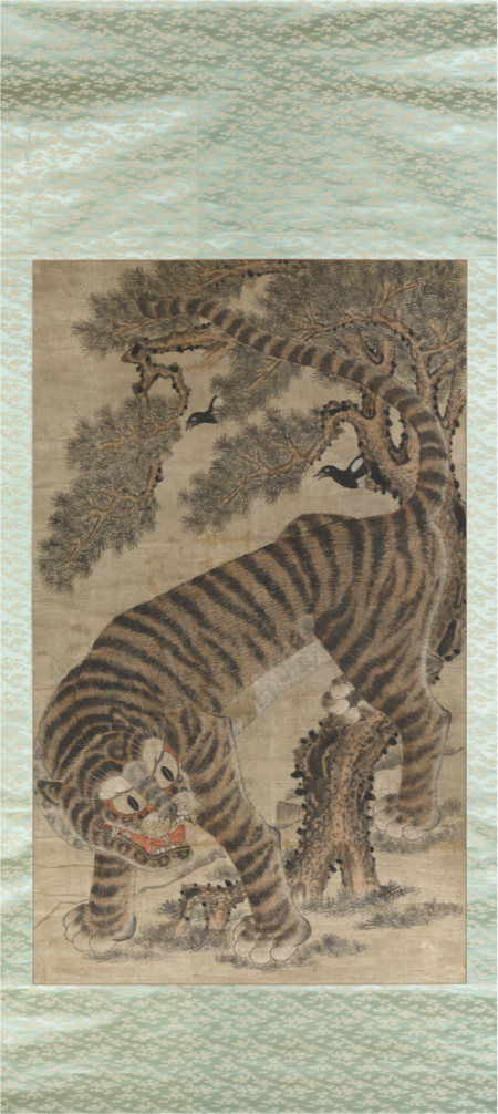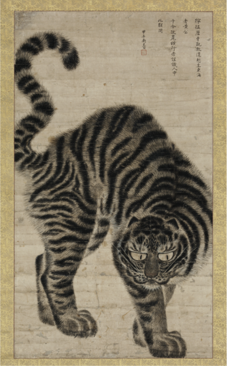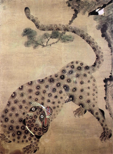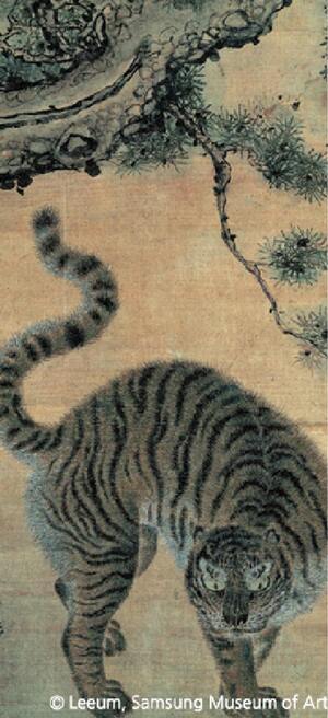 Свиток «Свирепый тигр под сосной» демонстрирует еще более выраженное стремление к натуралистичности образа. Современные исследователи, основываясь на содержании колофонов, считают, что фигуру тигра создал выдающийся придворный художник XVIII века Ким Хондо (1745–1806?), а сосну — его учитель, интеллектуал и критик Кан Сехван (1713–1791). Сосна изображена быстрыми динамичными мазками, в то время как величественный и неподвижный тигр выполнен с особой тщательностью и детализацией. Можно предположить, что Ким Хондо черпал вдохновение из этого свитка при создании своего тигра. Расположение фигуры в пространстве, сложная поза, изгибы спины и хвоста имеют сходство, но цветовая гамма, использованная мастером, делает образ еще более живым и натуралистичным. [5]
