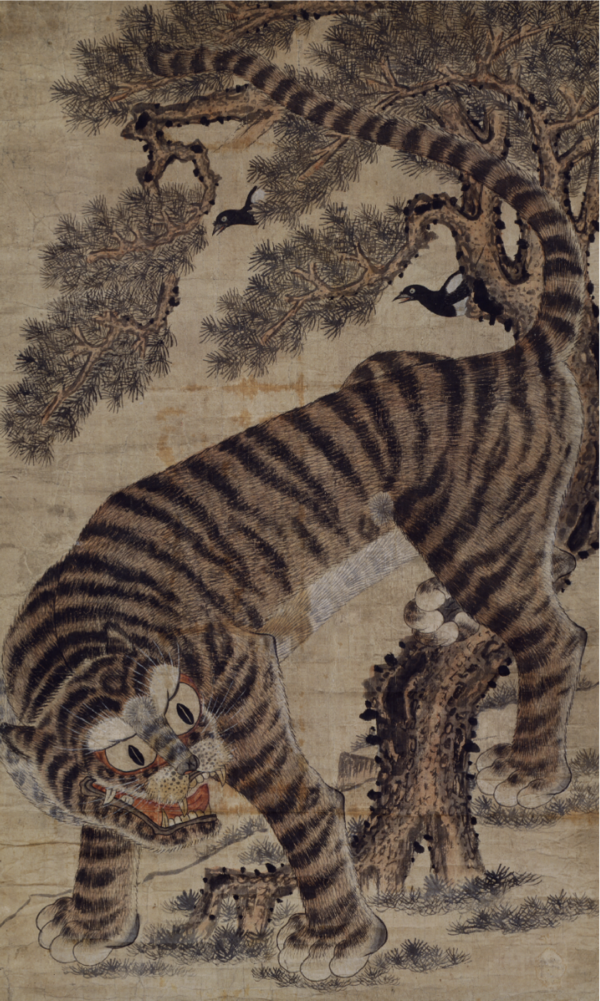 Неизвестный художник. «Тигр под сосной и сороки», XIX в. Бумага, тушь, водяные краски, 126,9×87 см. Пусанский музей, Пусан