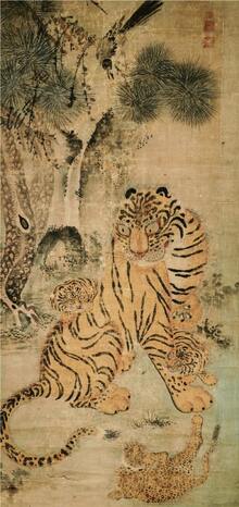 1 изобр. «Тигр под сосной» Другие названия: Сонгходо. Материал волокна — шелк Писатель Чон Хён Ам 2 изобр. Ким Хондо, Кан Сехван. «Свирепый тигр под сосной», конец XVIII в.