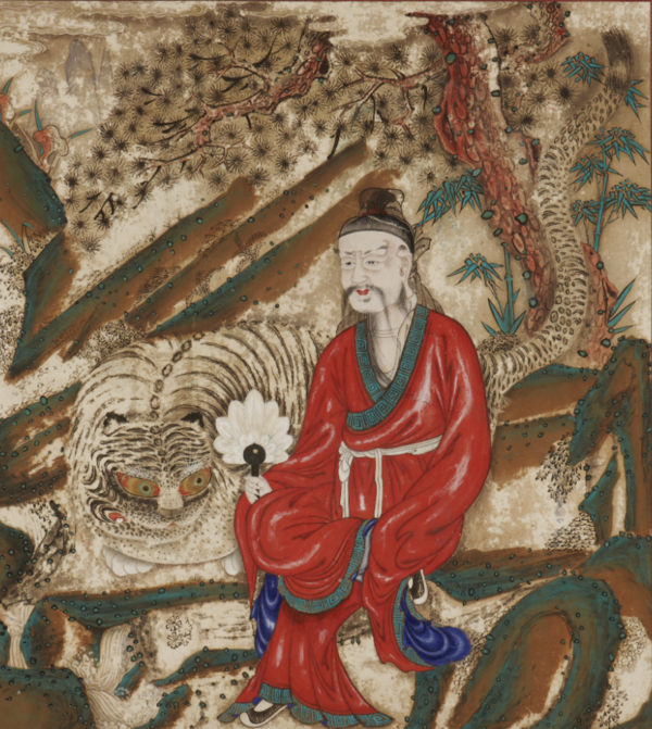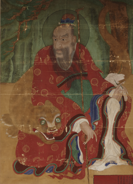 На картинах чаще всего изображен горный бог, который защищает гору и наблюдает за тем, что происходит на ней. Для этих картин характерно то, что седовласый, бородатый бессмертный бог и охраняющий его тигр изображены очень дружелюбны.Тигр, дикий зверь, изображен в юмористической манере.