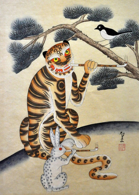 Реже можно встретить другой сюжет — тигр под сосной, курящий трубку, которую держит прислуживающий ему заяц. Мнения о его трактовке также расходятся. С одной стороны, сюжет явно сказочный и юмористический. Кстати, некоторые народные корейские сказки вместо «Давным-давно…» начинаются со слов «Когда тигры курили трубку…». Но, если учесть, что табак попал в Корею из Японии в 1618 г., мы точно знаем, когда они обрели эту привычку. Другие исследователи соотносят сюжет с 12-летним годичным циклом, где год тигра предшествует году кролика/зайца, что снова наводит на мысль об иерархических отношениях. [3]