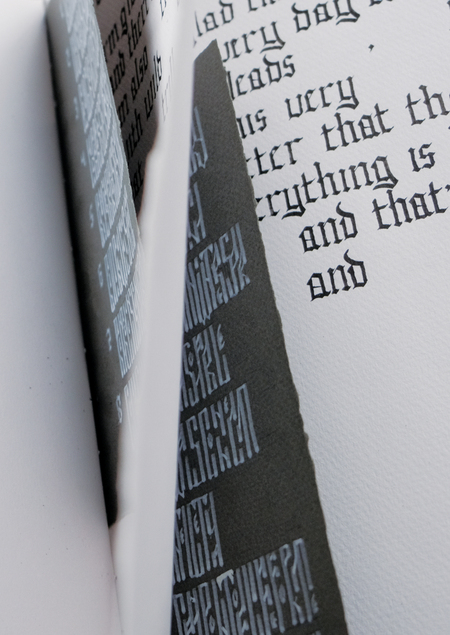 Книжка состоит из англоязычныго перевода стихов Калеко с как бы удаленными цензурой словами, написанный готикой и удаленными из основного текста словами, написанными упрощенной минималистичной версией вязи.